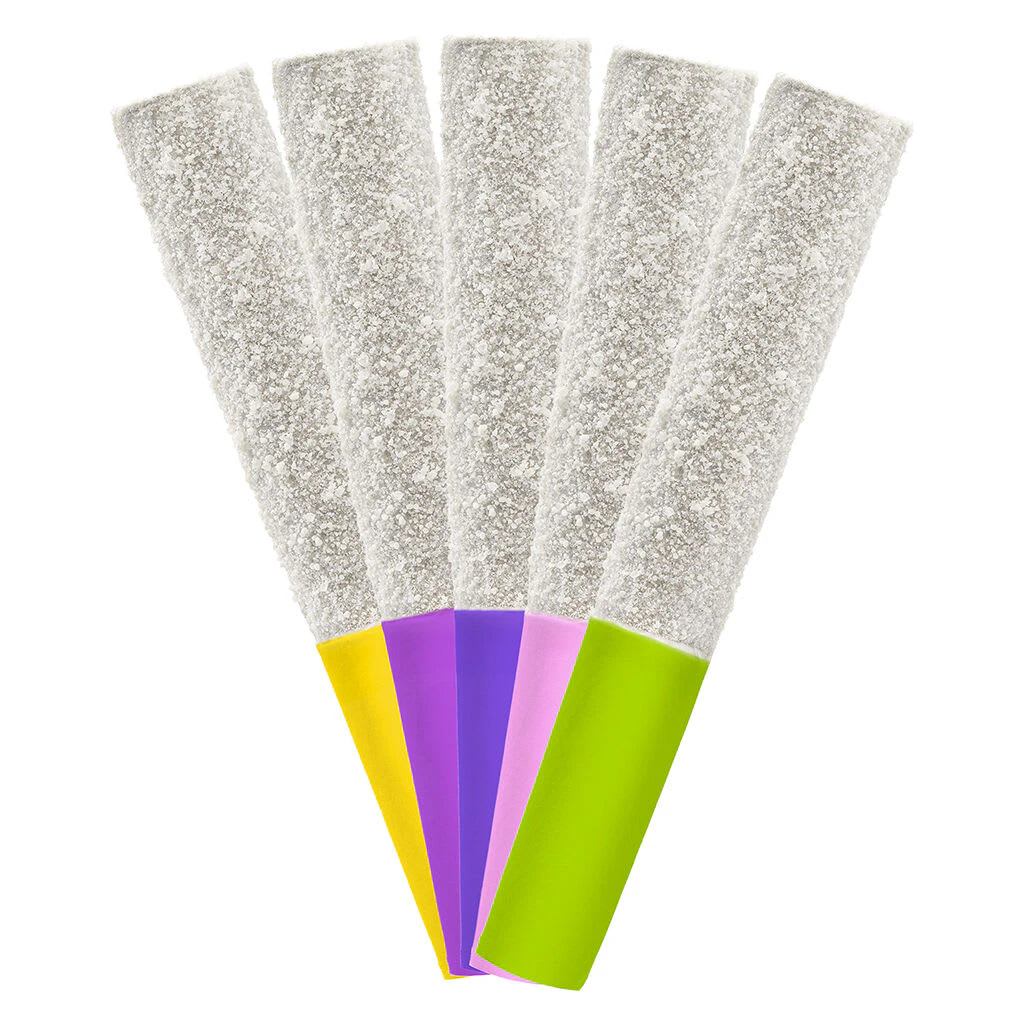 Introducing the Nugz Flavour Bomb Infused Pre-Roll Taster Pack. Five nostalgic, flavour forward, diamond infused pre-rolls packed into one collection. Each pre-roll is meticulously crafted with indoor grown flower, never irradiated, infused and coated with THCA diamonds to deliver an intense, high THC and full flavour experience.
