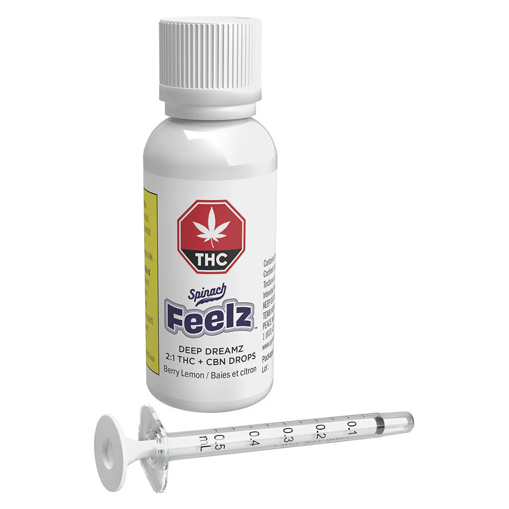 Spinach FEELZ Deep Dreamz THC+CBN Drops with mixed berry and lemon flavour notes and our special blend of THC and rare cannabinoid CBN. 30 ml of oil that contains 600 mg of THC and 300 mg of CBN per bottle and can be dropped under the tongue.